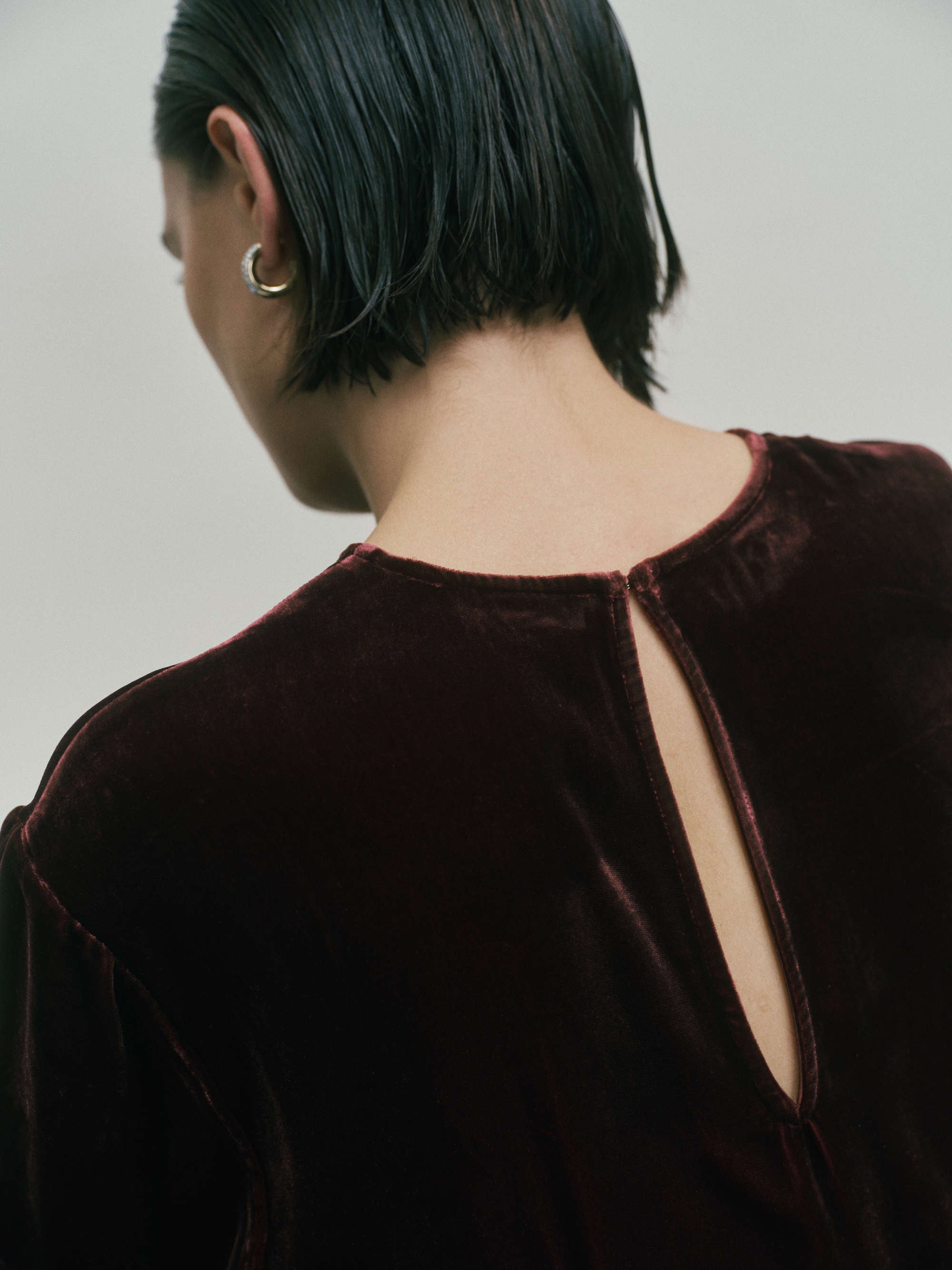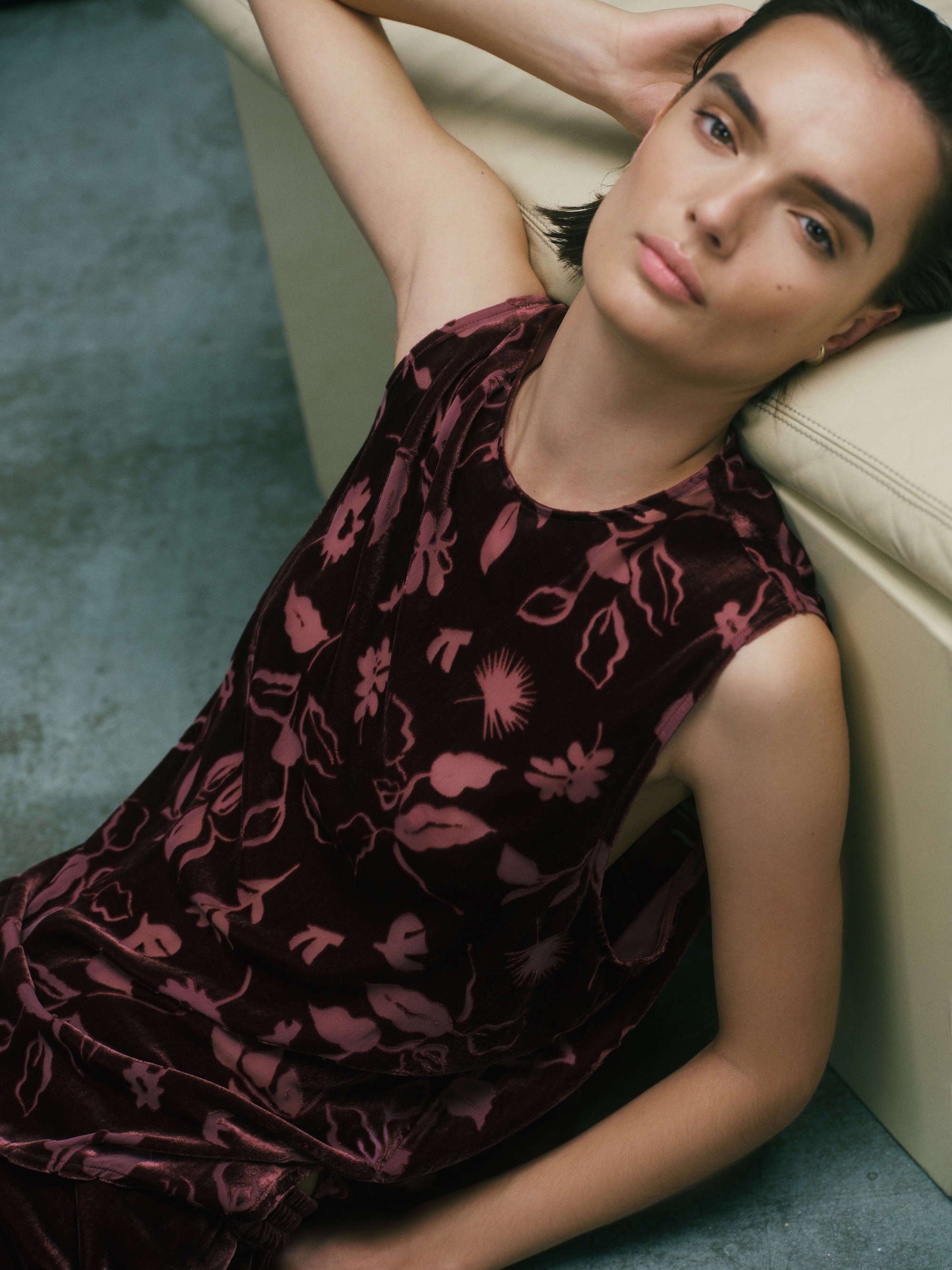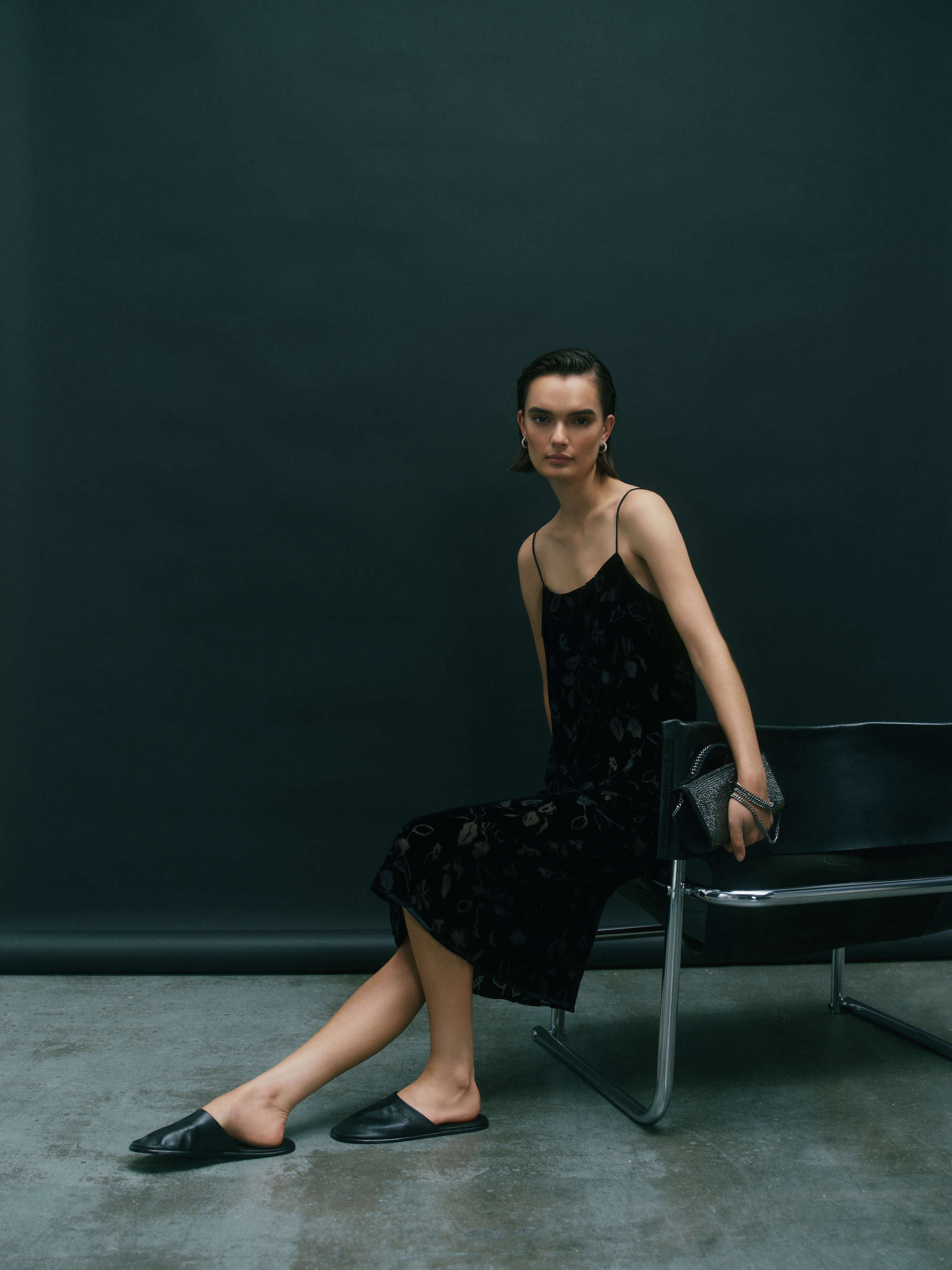 Devore velvet, with cut-away sheer floral patterns, brings a new take to velvet; and a breadth of dress-up evening-wear options for the holiday season. New styles in elevated black silk charmeuse bring a sophistication to party season.
